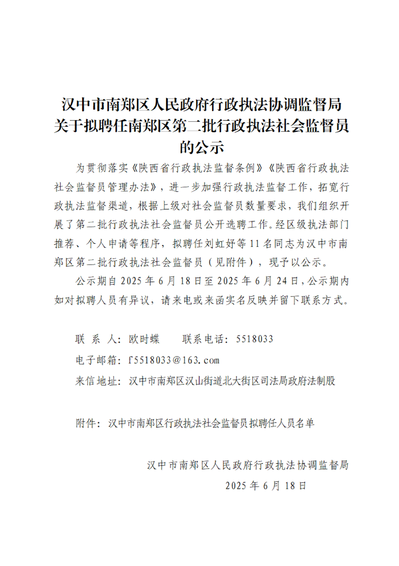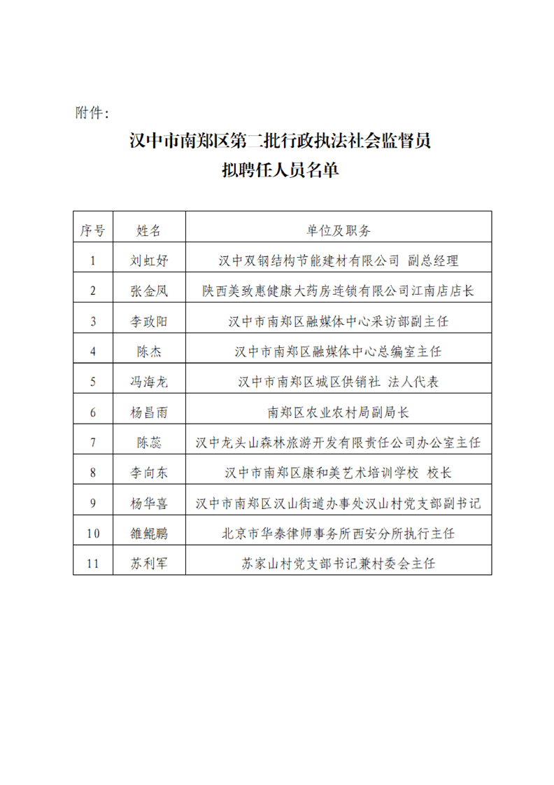 汉中市hth网页版下载行政执法协调监督局关于拟聘任南郑区第二批行政执法社会监督员的公示
