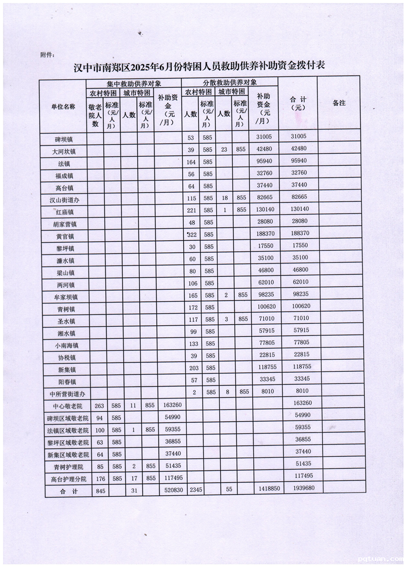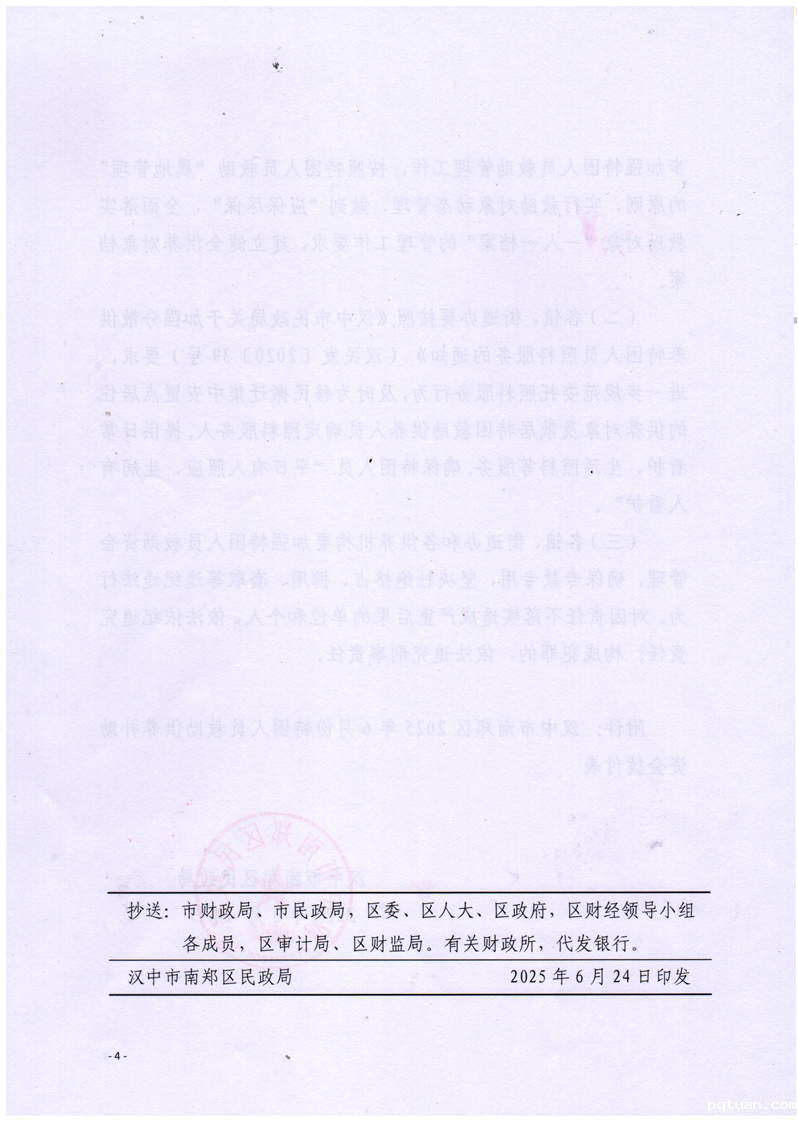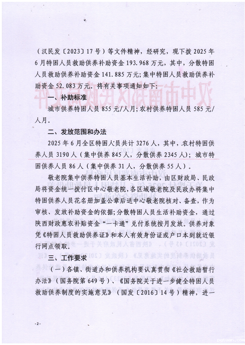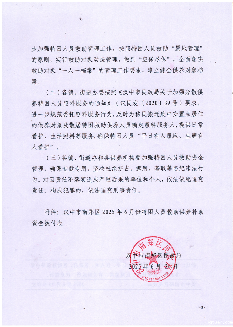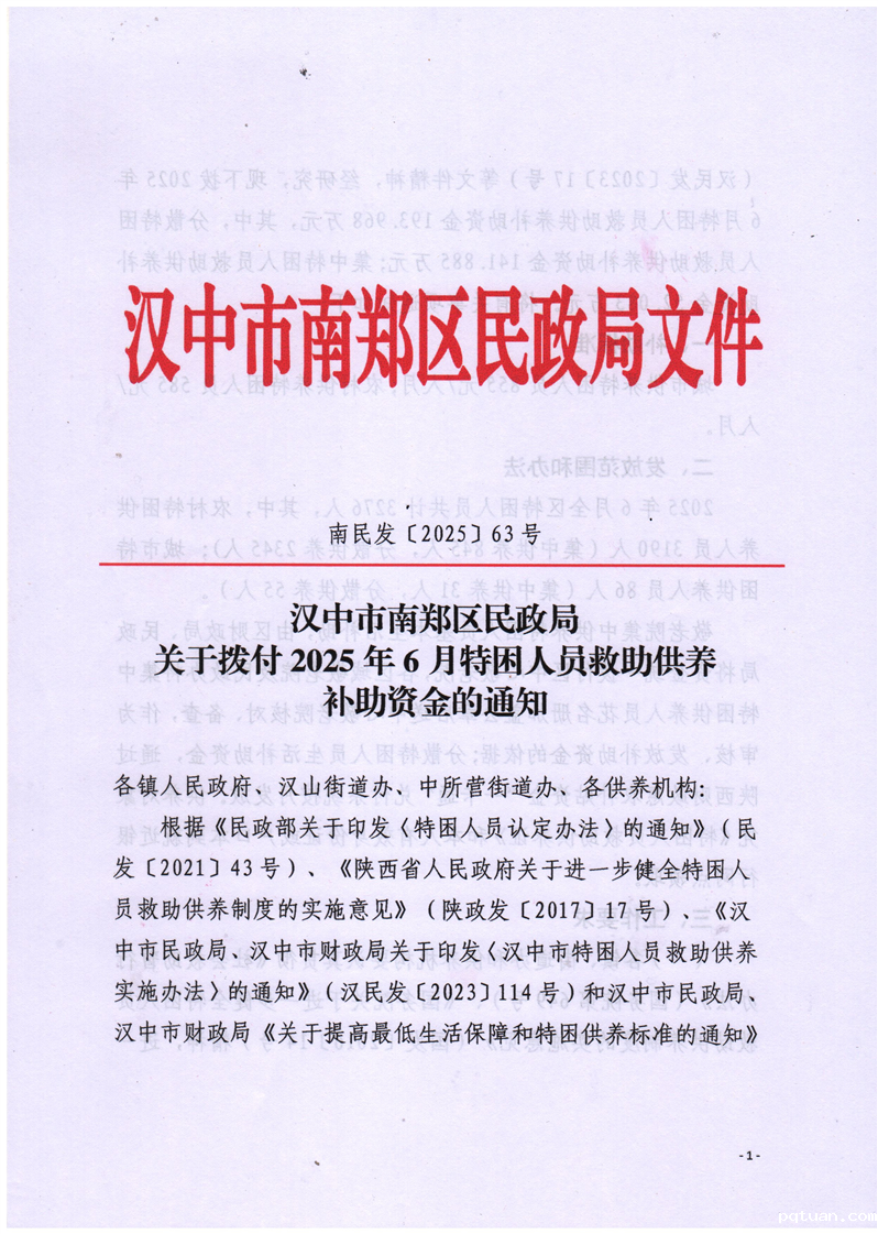 汉中市南郑区民政局关于拨付2025年6月特困人员救助供养补助资金的通知