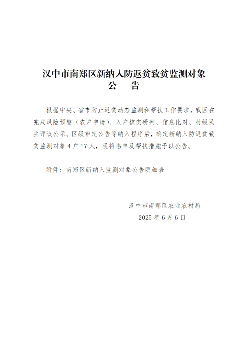 汉中市南郑区新纳入防返贫致贫监测对象公告