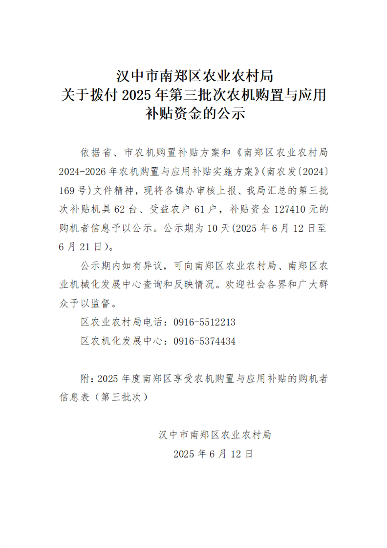 汉中市南郑区农业农村局关于拨付2025年第三批次农机购置与应用补贴资金的公示