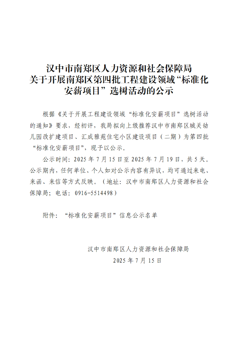 汉中市南郑区人力资源和社会保障局关于开展南郑区第四批工程建设领域“标准化安薪项目”选树活动的公示