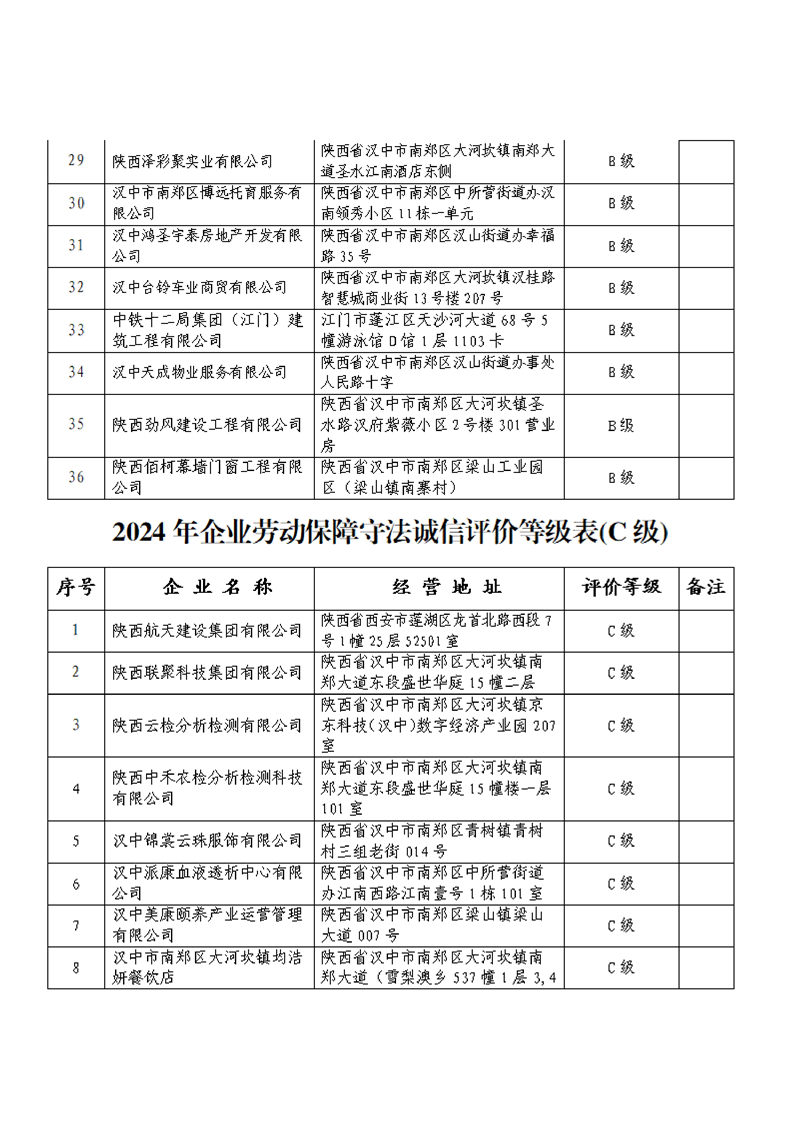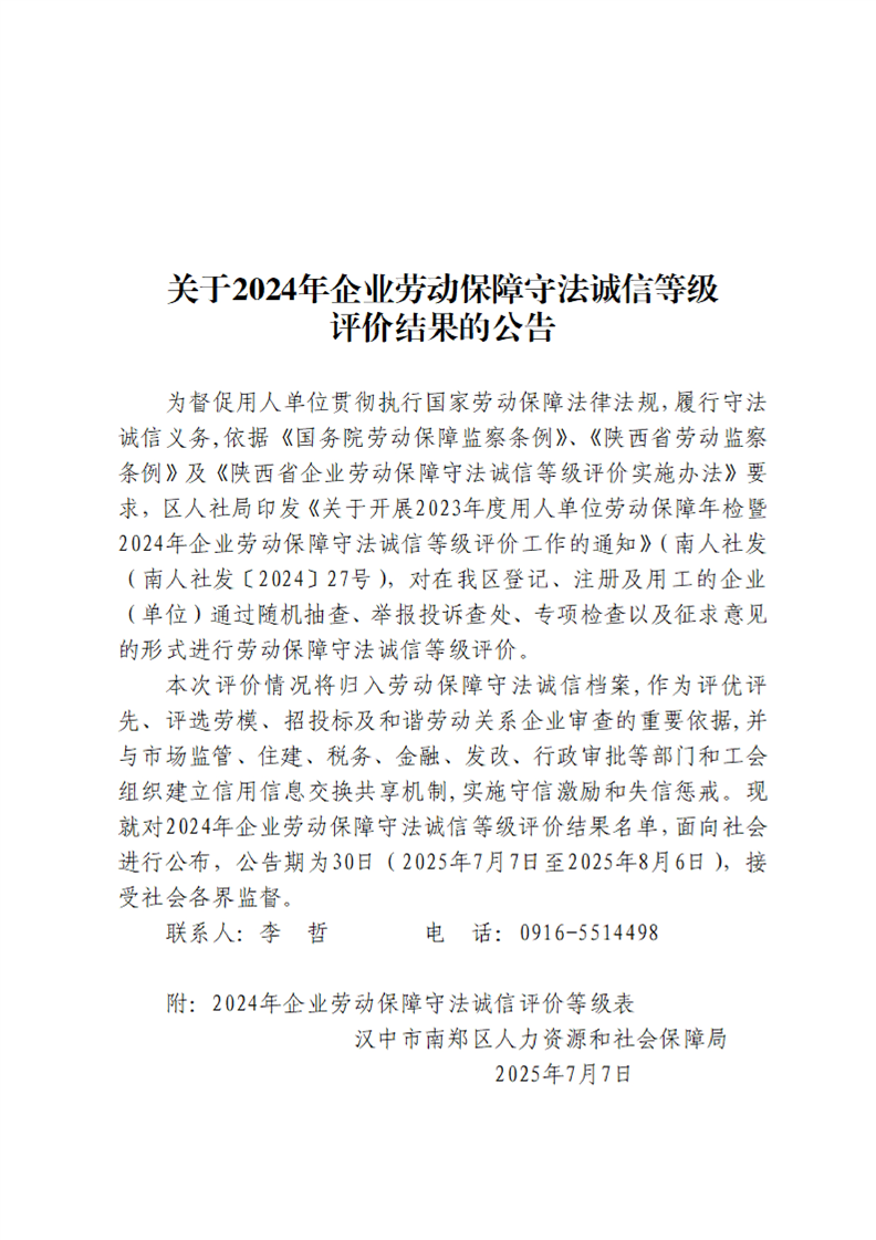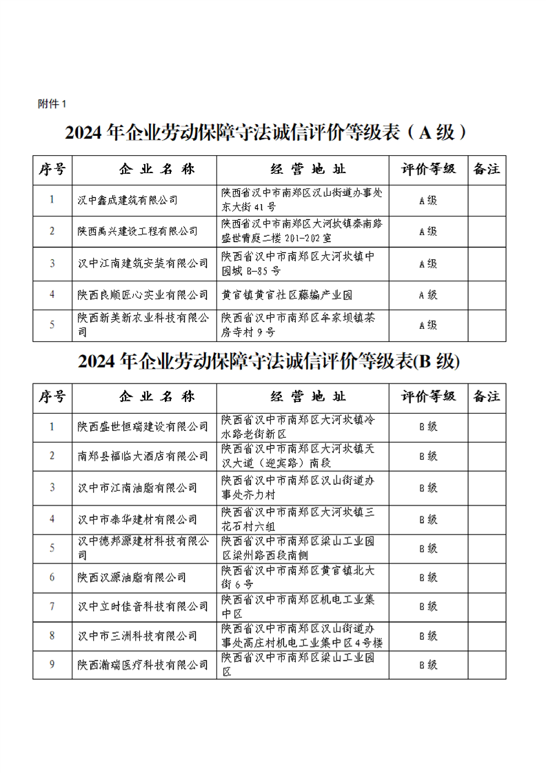 关于2024年企业劳动保障守法诚信等级评价结果的公告