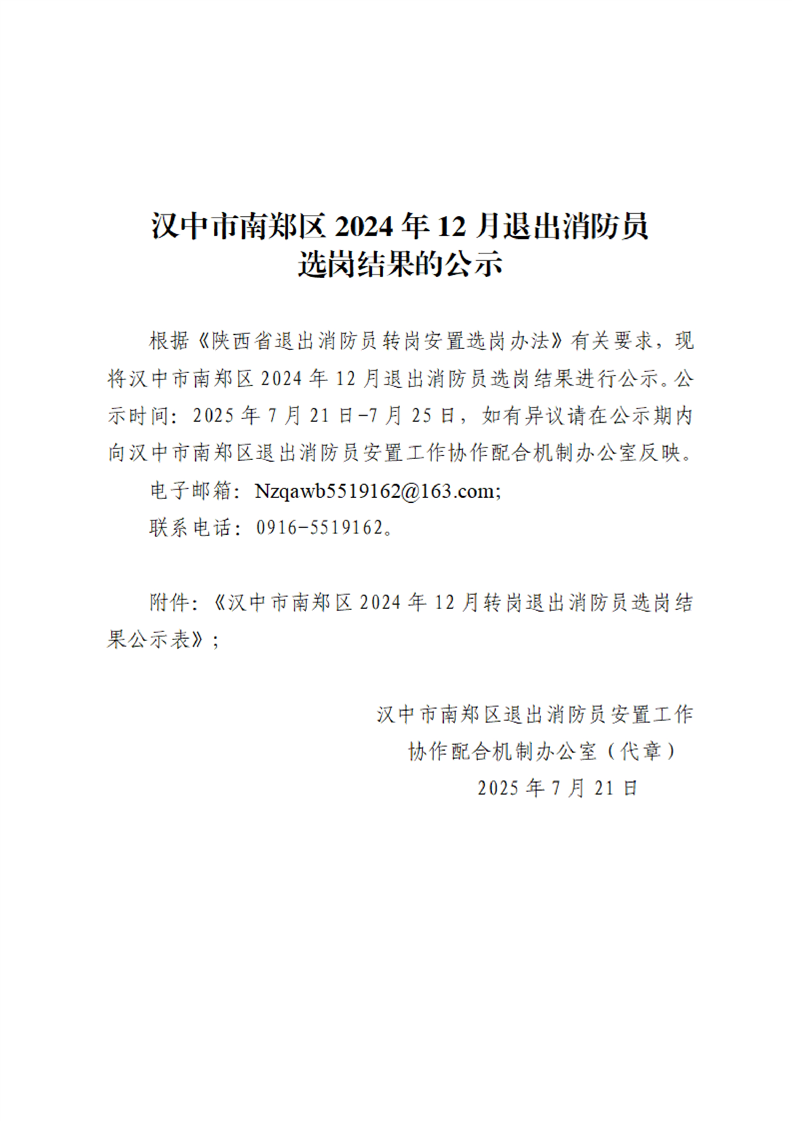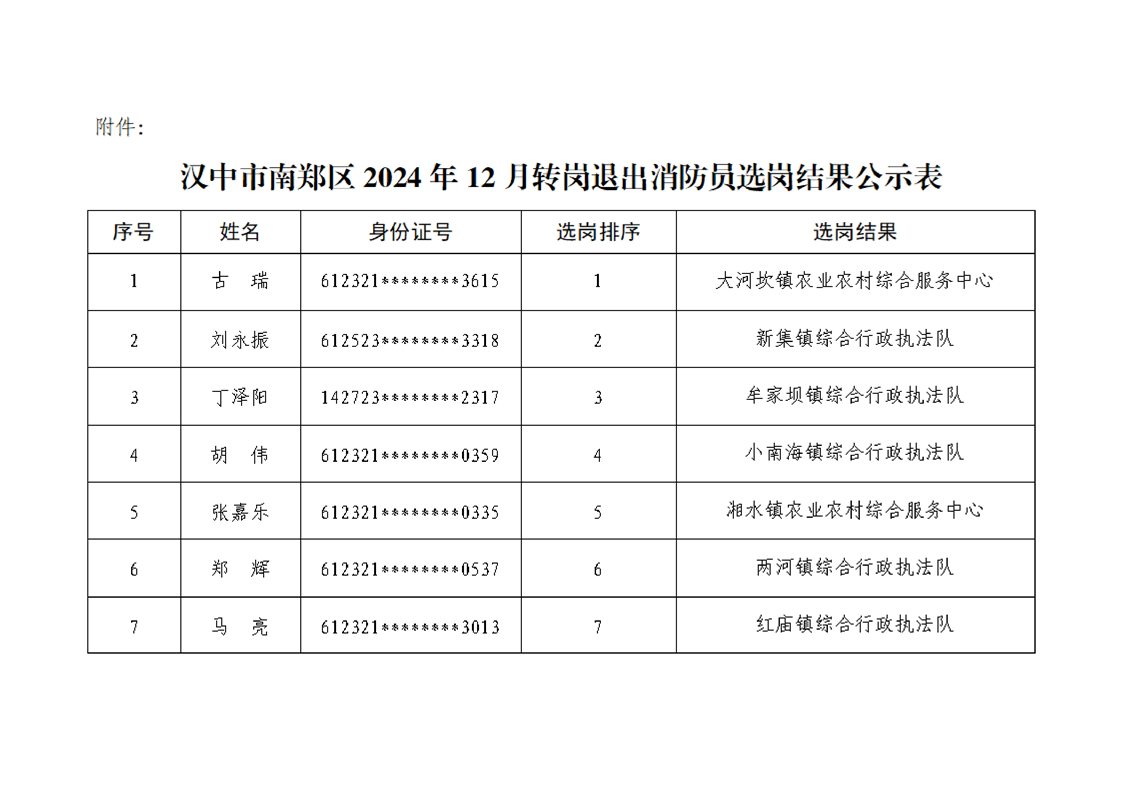 汉中市南郑区2024年12月退出消防员选岗结果的公示