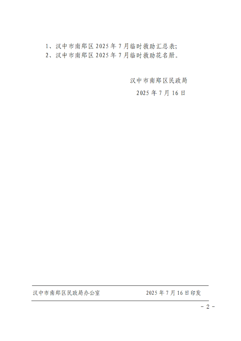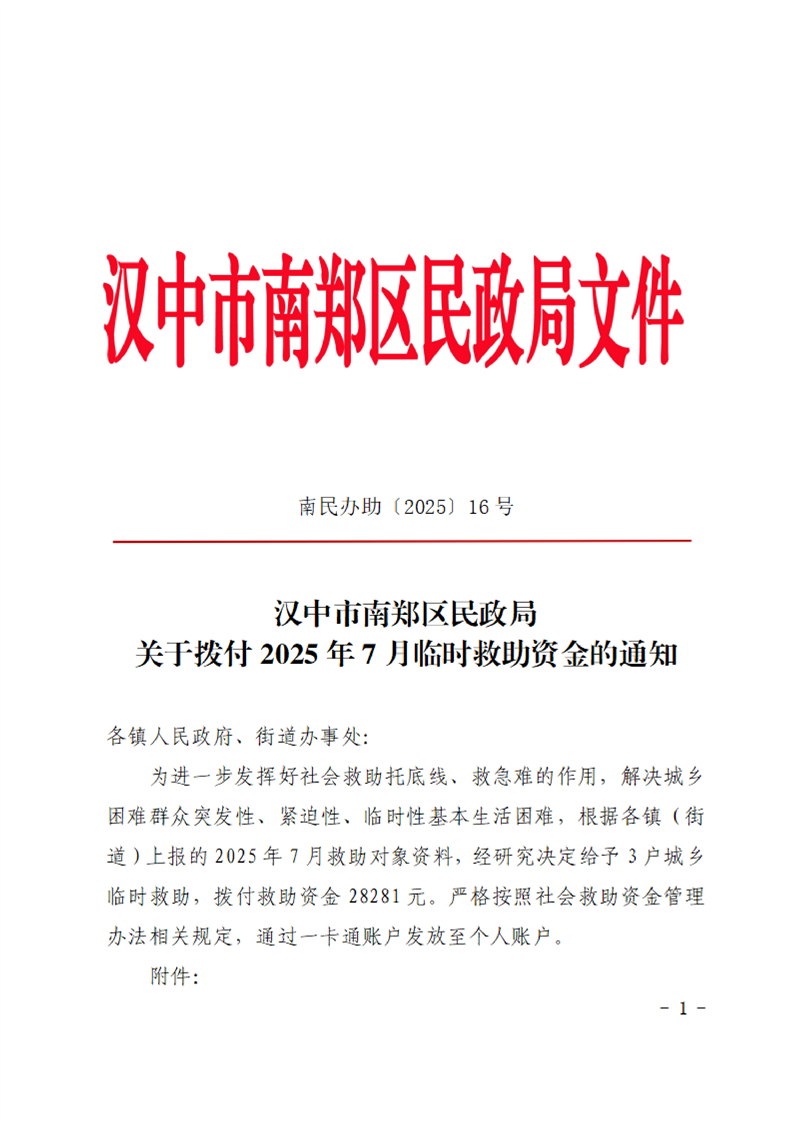 汉中市南郑区民政局关于拨付2025年7月临时救助资金的通知