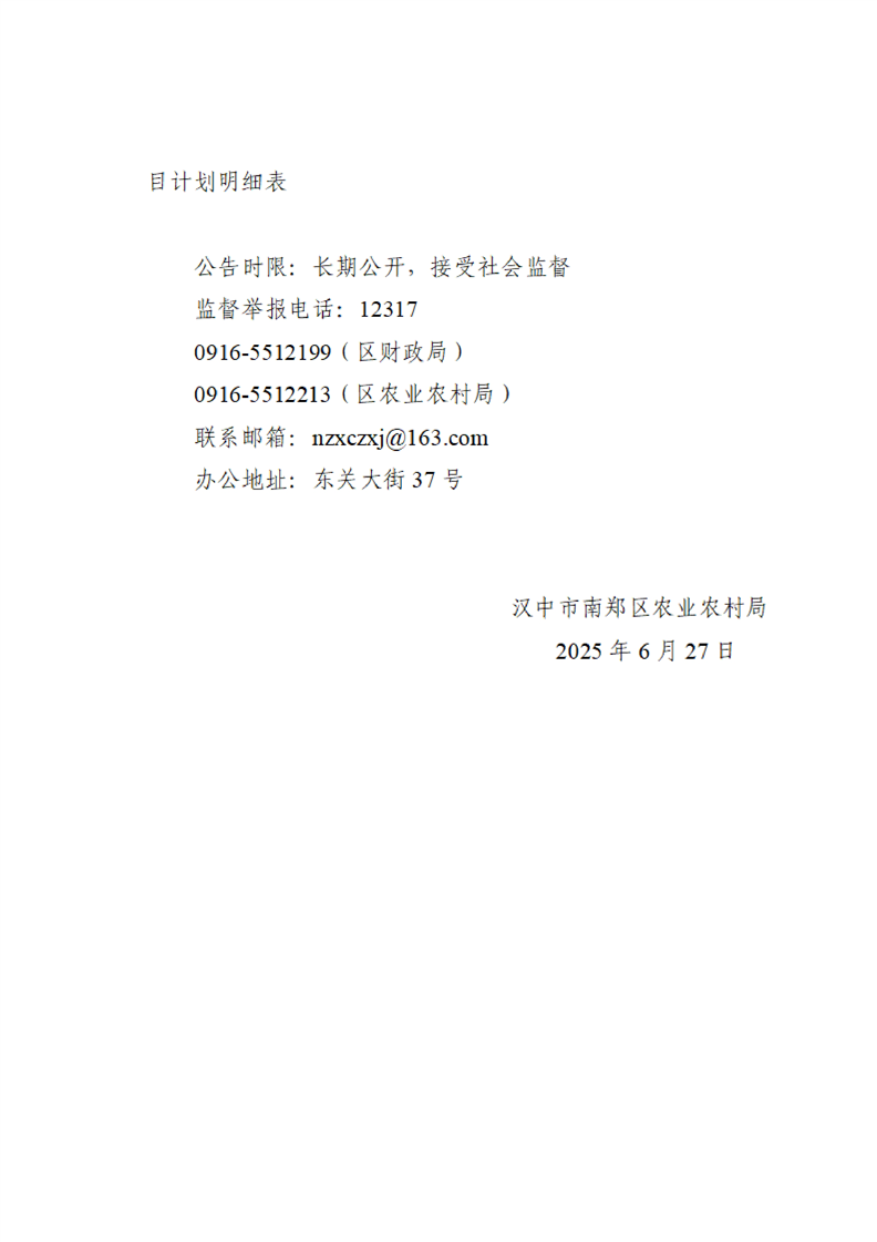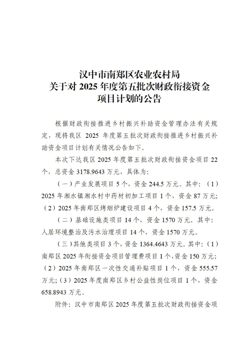 汉中市南郑区农业农村局关于对2025年度第五批次财政衔接资金项目计划的公告