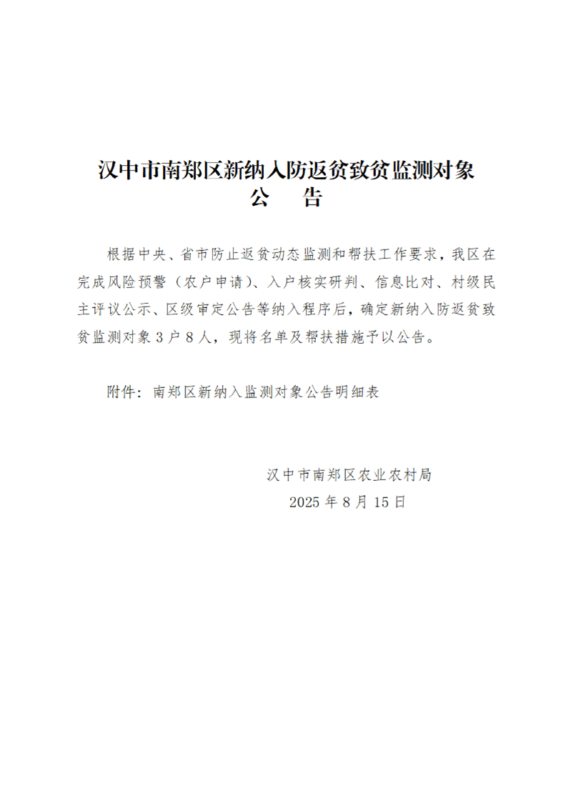 汉中市南郑区新纳入防返贫致贫监测对象公告