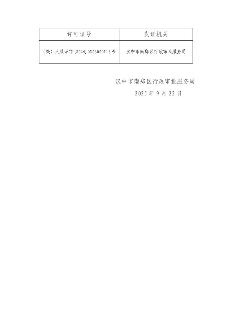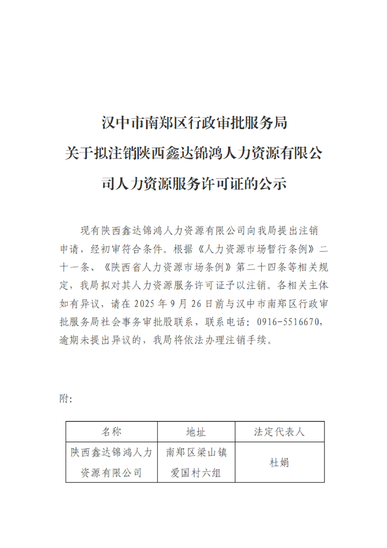 汉中市南郑区行政审批服务局关于拟注销陕西鑫达锦鸿人力资源有限公司人力资源服务许可证的公示
