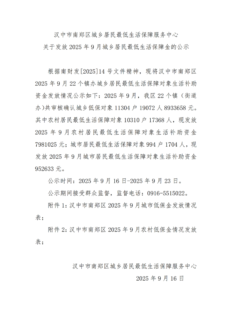 汉中市南郑区城乡居民最低生活保障服务中心关于发放2025年9月城乡居民最低生活保障金的公示