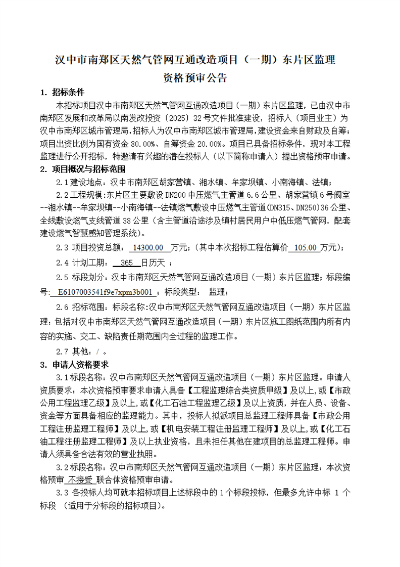 汉中市南郑区天然气管网互通改造项目(一期)东片区监理资格预审公告