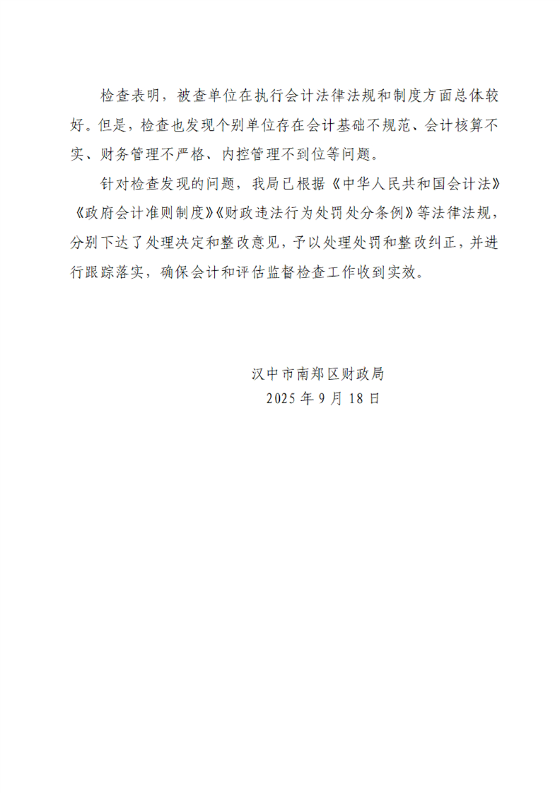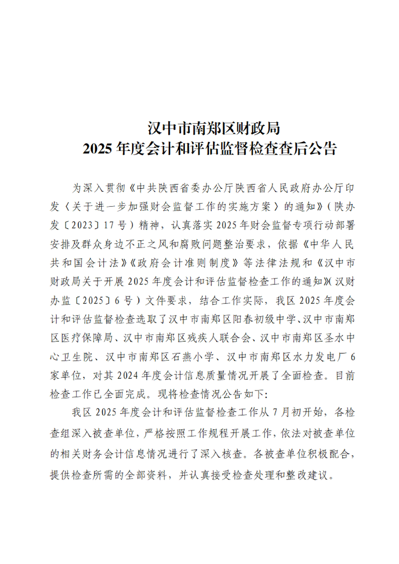 汉中市南郑区财政局2025年度会计和评估监督检查查后公告