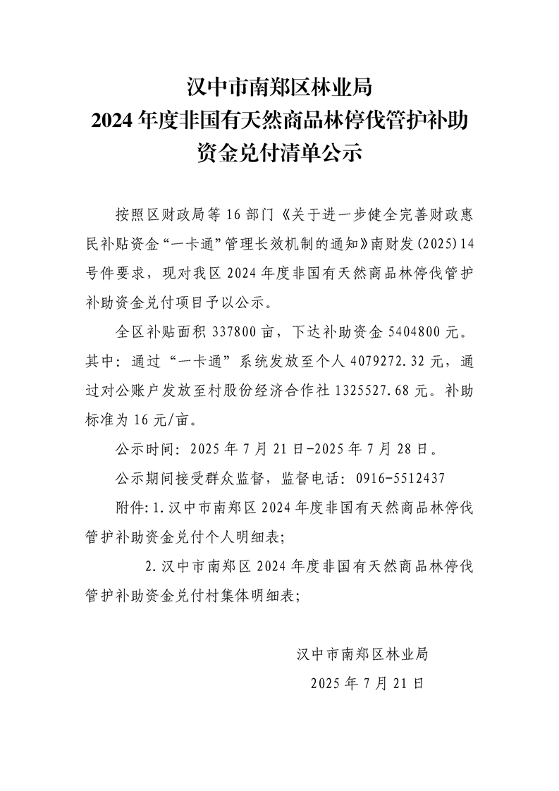 汉中市南郑区林业局2024年度非国有天然商品林停伐管护补助资金兑付清单公示