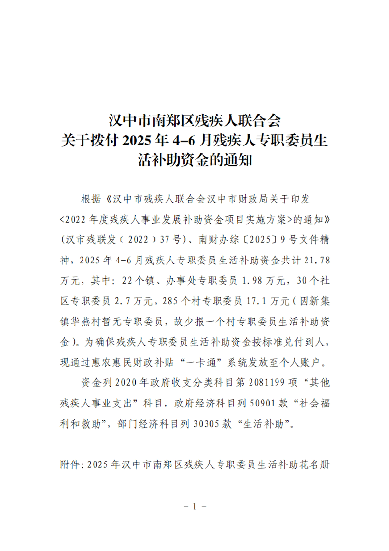 汉中市南郑区残疾人联合会关于拨付2025年4-6月残疾人专职委员生活补助资金的通知