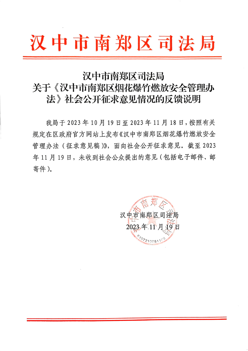 关于《汉中市南郑区烟花爆竹燃放安全管理办法》社会公开征求意见情况的反馈说明