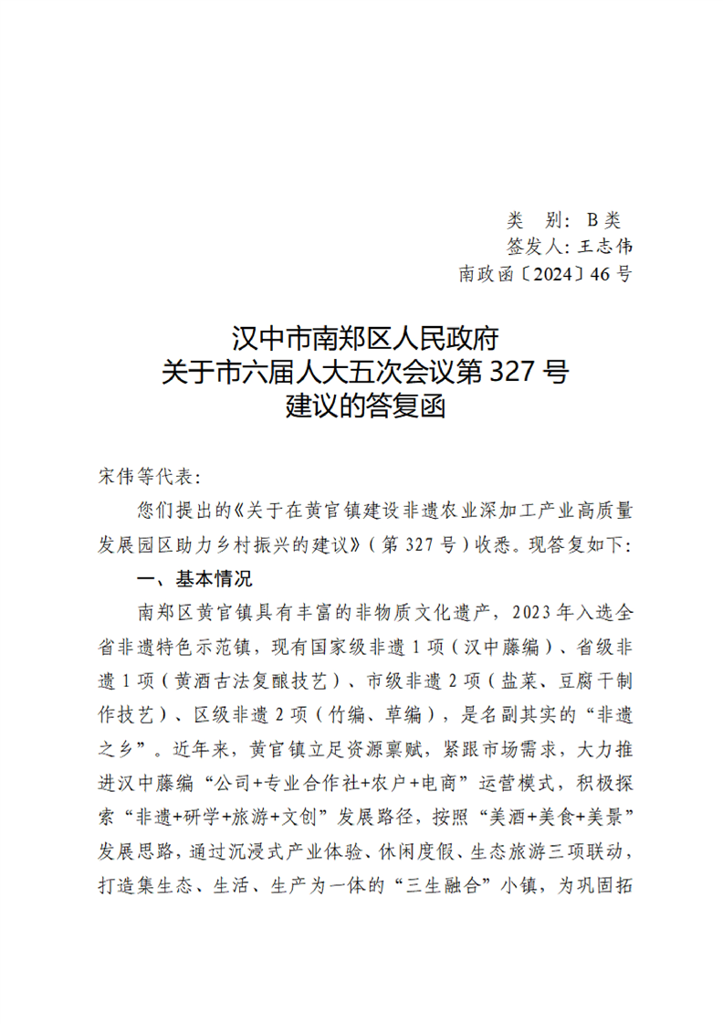 汉中市hth网页版下载关于市六届人大五次会议第327号建议的答复函