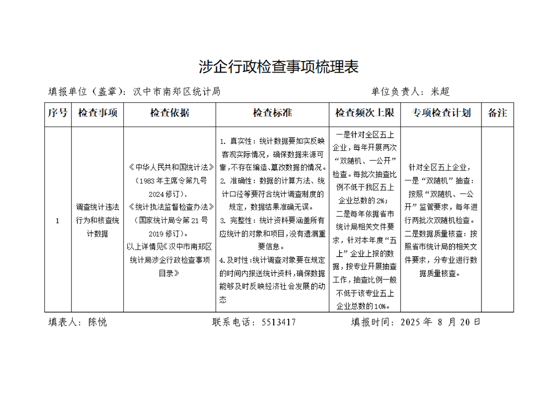区统计局涉企行政检查事项梳理表