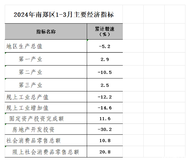 2024年南郑区1-3月主要经济指标