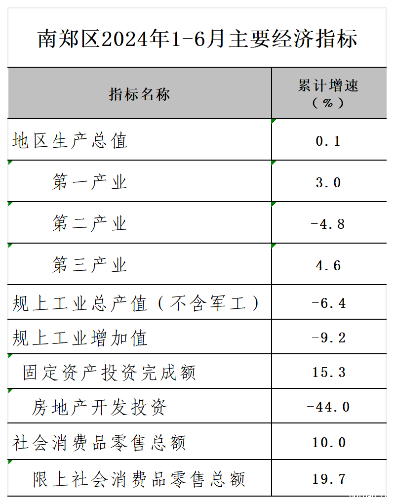 南郑区2024年1-6月主要经济指标