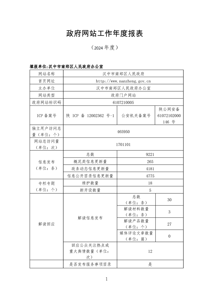 汉中市南郑区政府网站工作年度报表(2024年度)