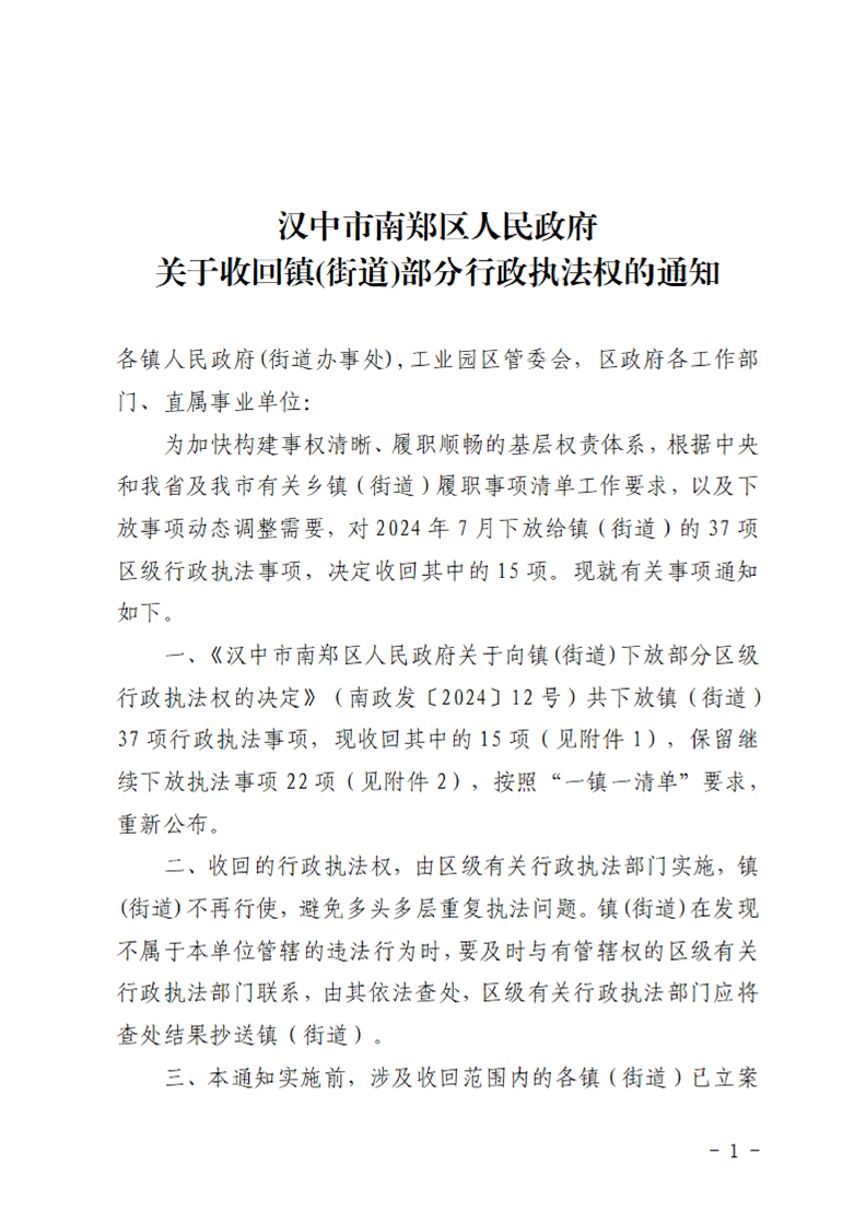 汉中市hth网页版下载关于收回镇(街道)部分行政执法权的通知
