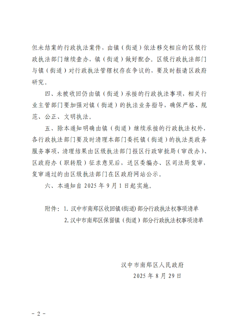 附件2:汉中市南郑区保留镇(街道)部分行政执法权事项清单