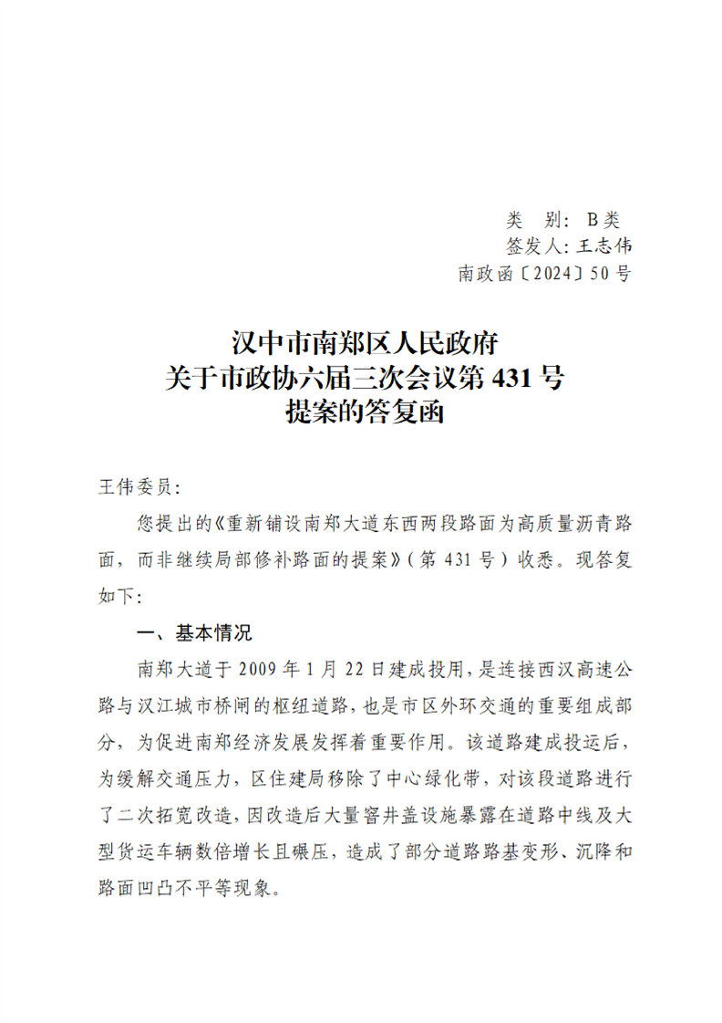 汉中市hth网页版下载关于市政协六届三次会议第431号提案的答复函