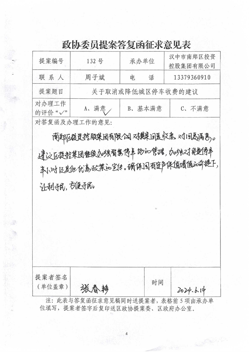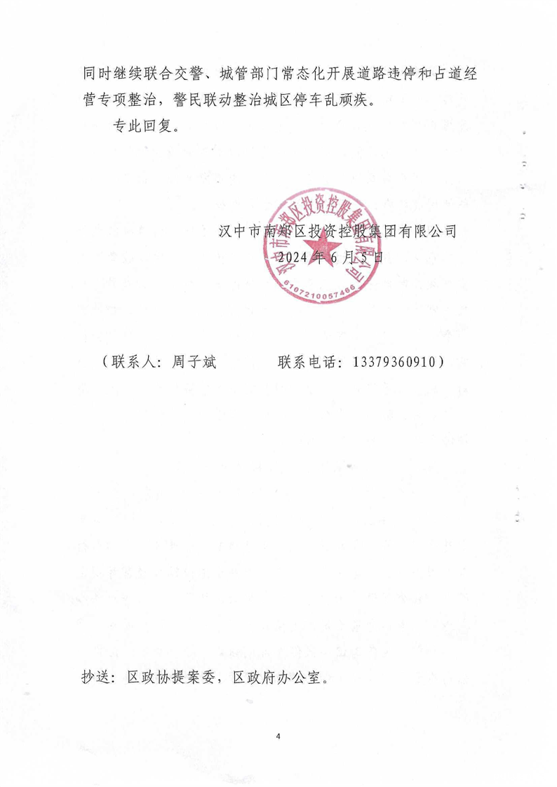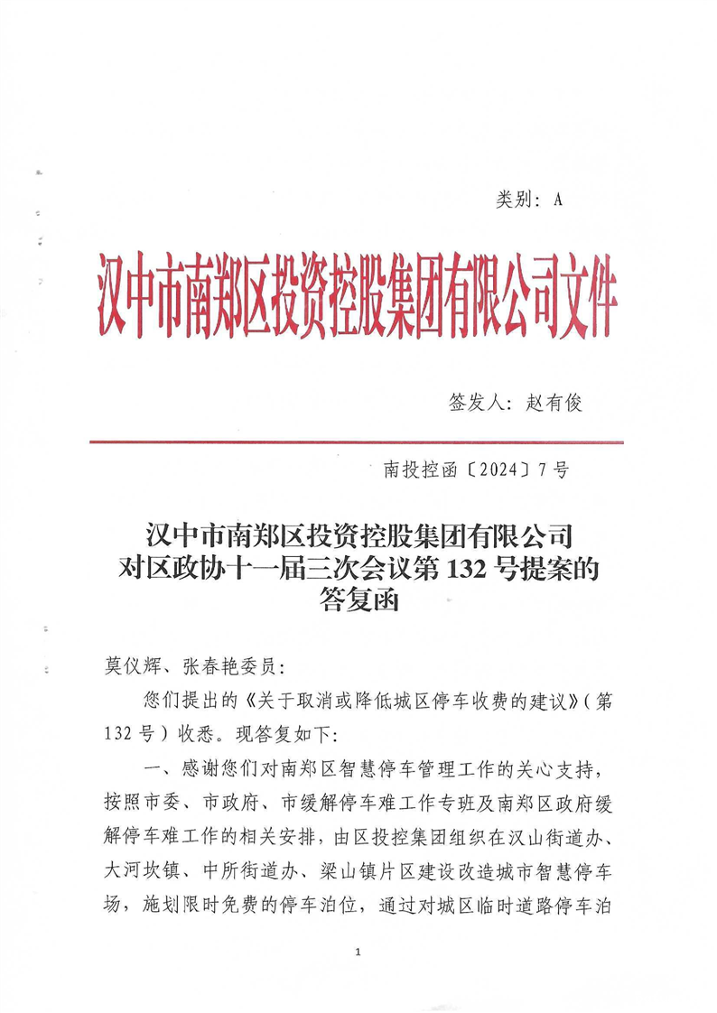 汉中市南郑区投资控股集团有限公司对区政协十一届三次会议第132号提案的答复函